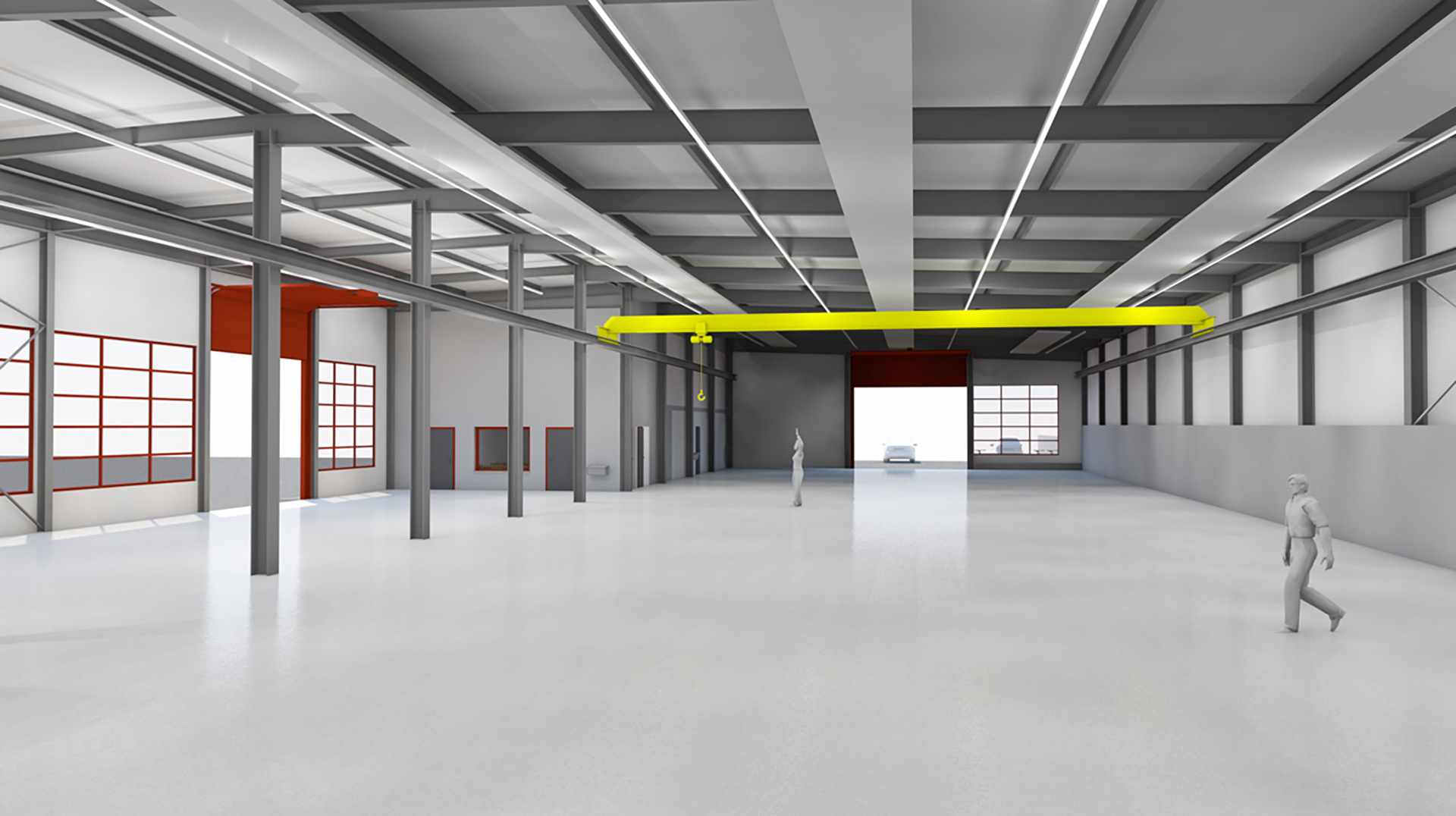 • Der Bürobereich ist komplett vom Hallenteil getrennt, damit die Geräuschentwicklungen aus dem Bereich Halle nicht in den Büroteil übertragen werden (Körperschall aus Kranbetrieb, Stanzmaschinen etc.).