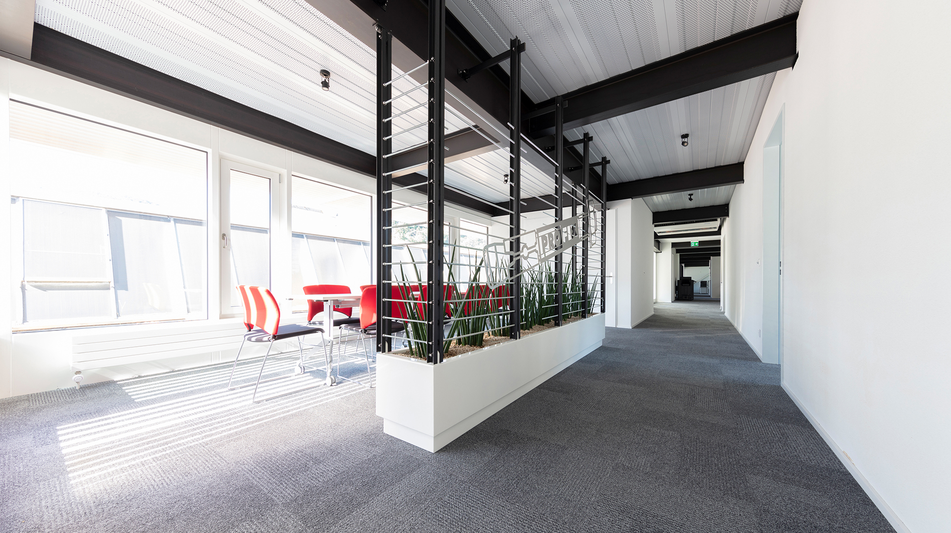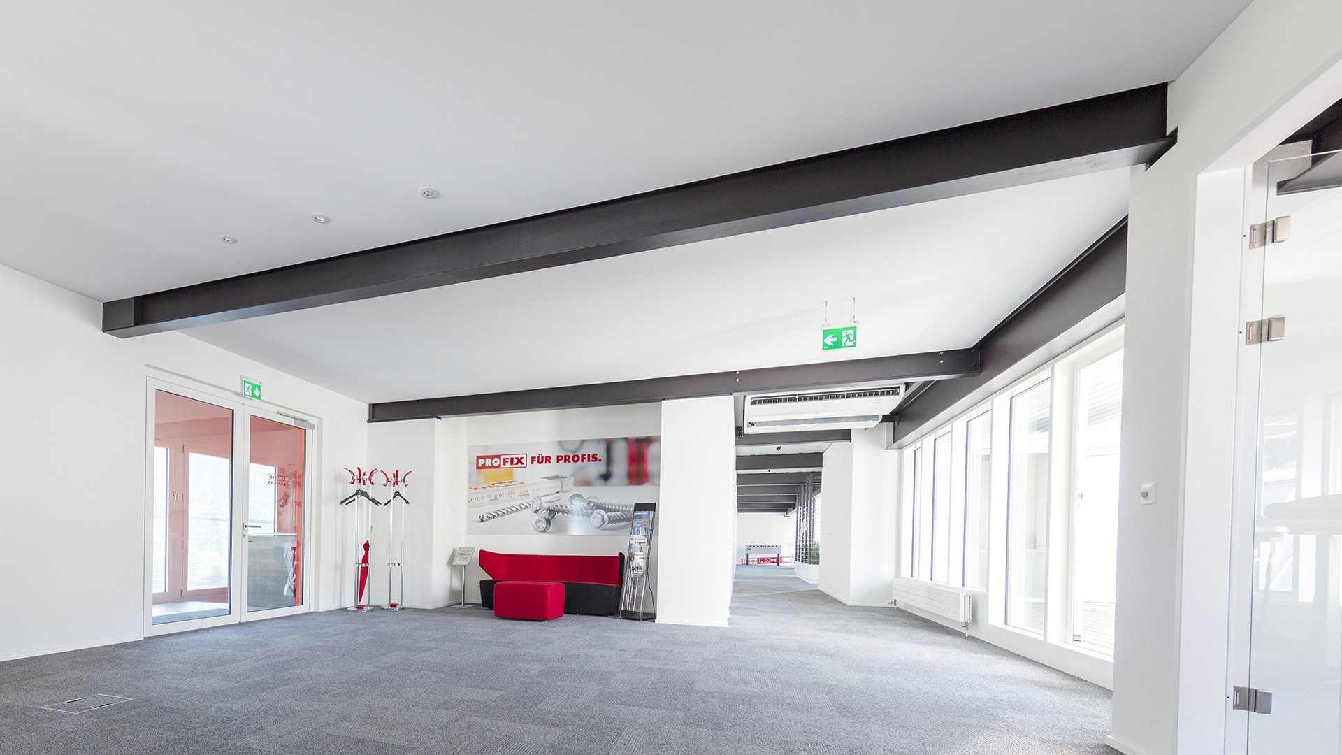 - Sekundärträger wurden zu Fachwerken umfunktioniert. Und als Unterbau des Bürobaus wurden von der Decke
