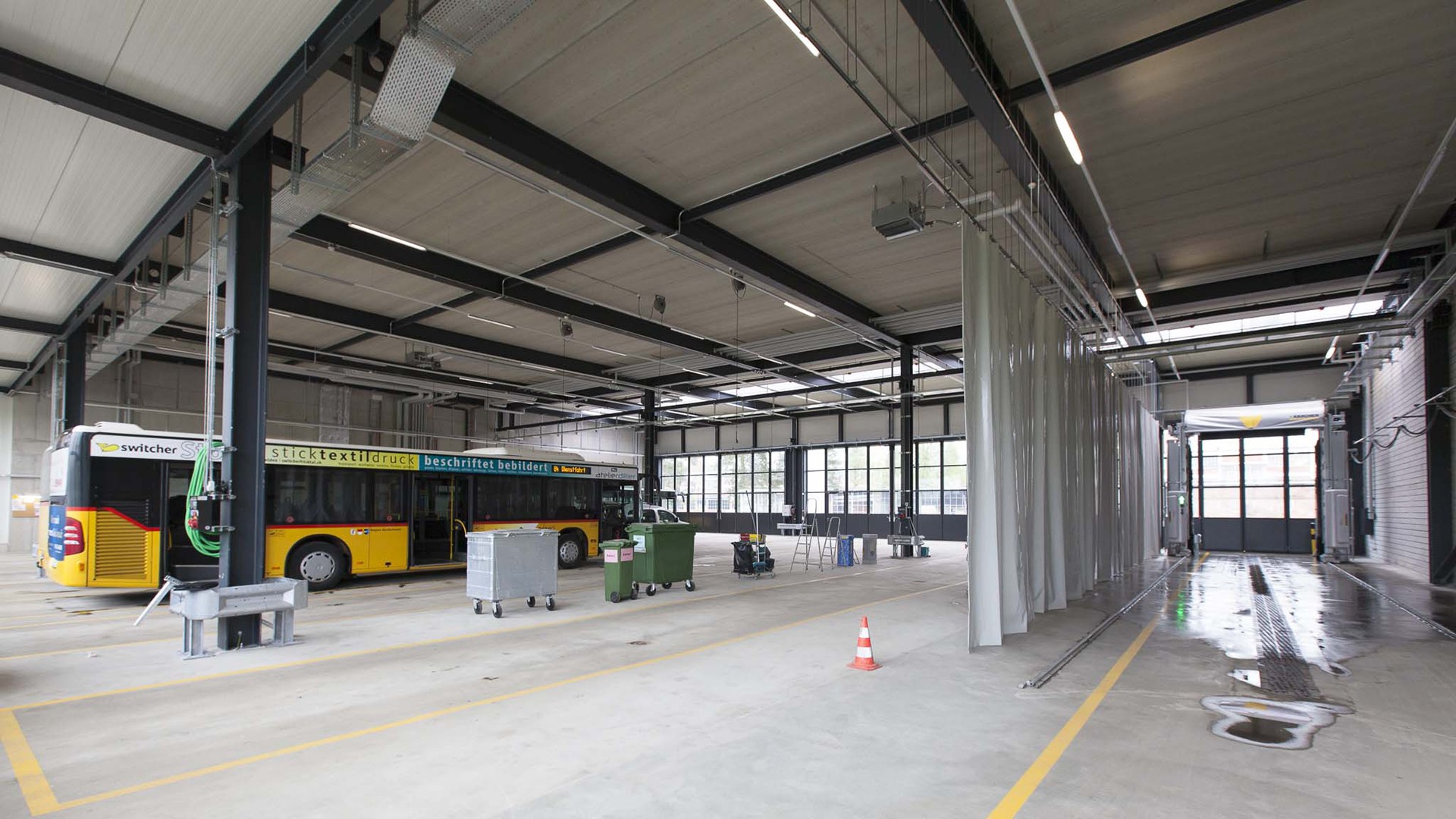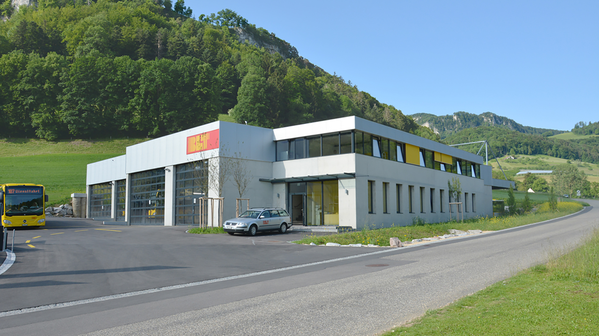 - Damit auf der engen Parzelle das Verkehrskonzept möglichst grosszügig gelöst werden konnte, wurde die Busgarage von der Strasse distanziert. Dies ermöglichte das Ein- und Ausfahren der Busse ohne Korrekturmanöver. Auf dem verbleibenden Bereich wurde der Verwaltungsbau auf zwei Geschossen erstellt.