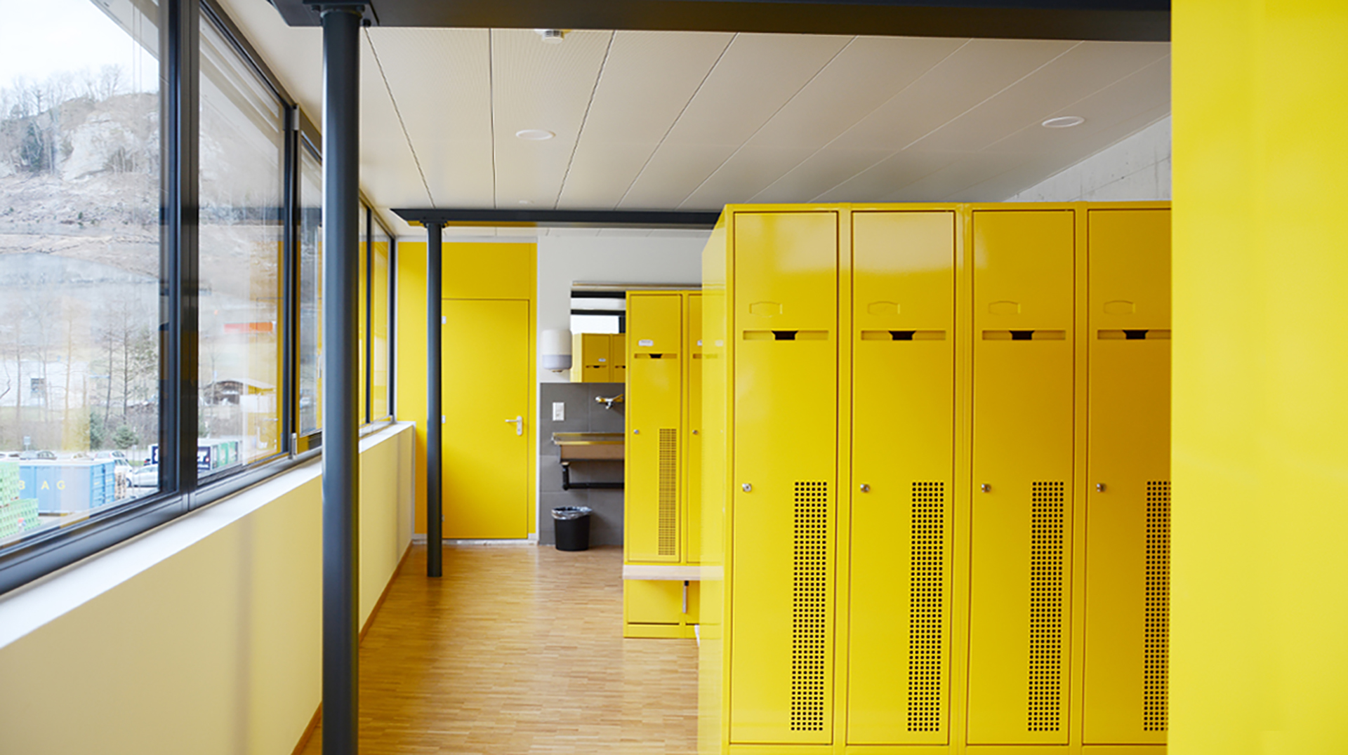 - Weil die Bushalle nicht beheizt wurde, war es auf einfache Weise möglich, die Tore an Betonwände zu befestigen. So erhielt das Gebäude einen unteren Bereich aus Sichtbeton. Diese Betonoptik wurde im Erdgeschoss des Verwaltungsgebäudes weitergeführt, mit einer innenliegenden Wärmedämmung.