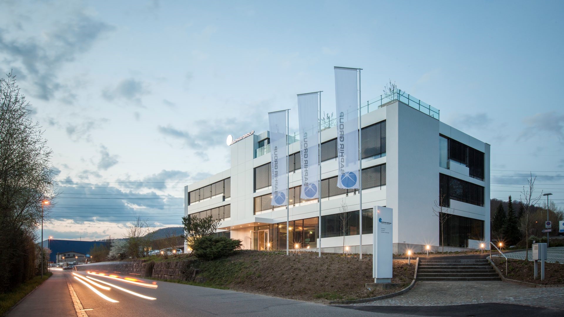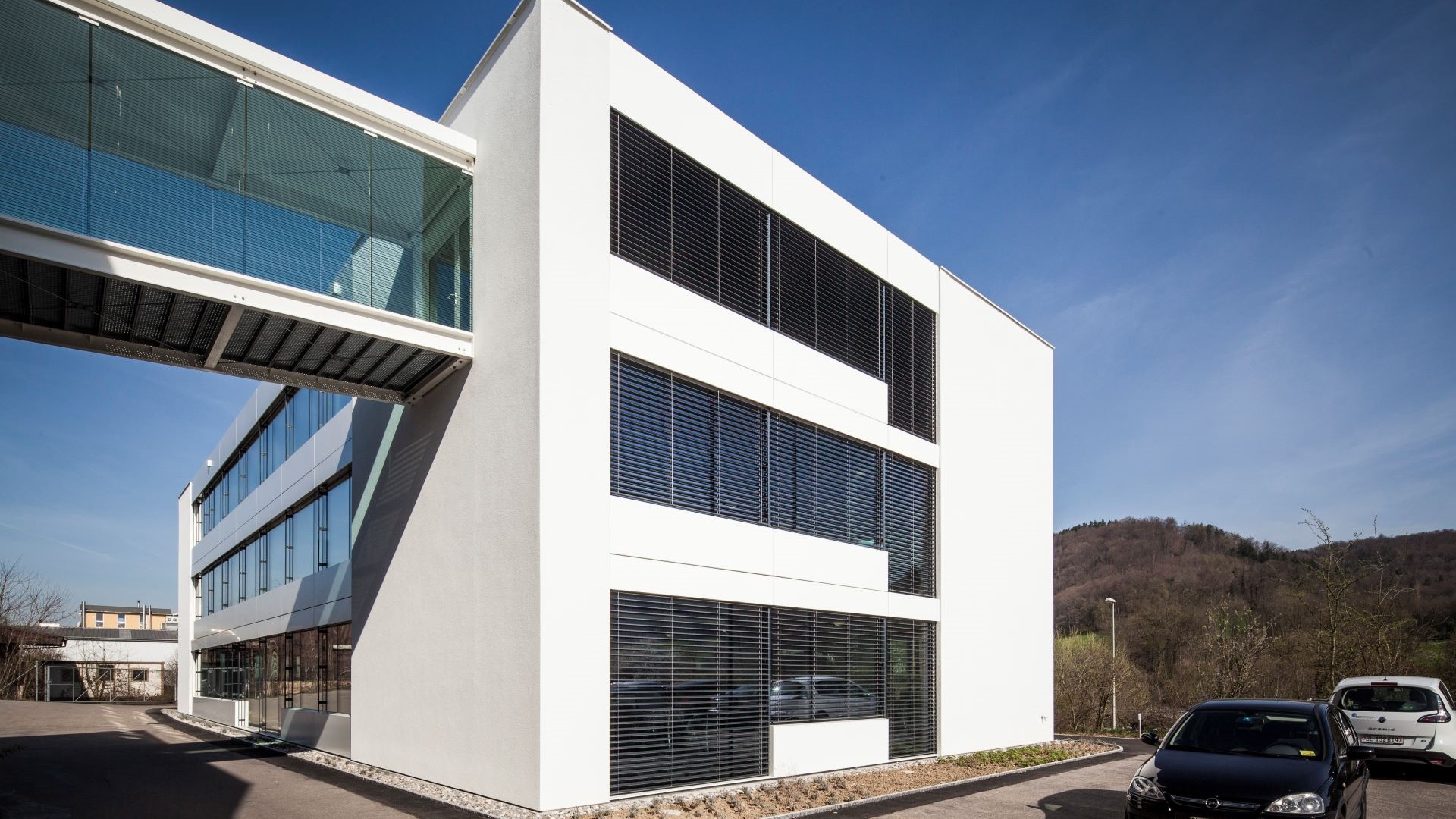 • Die äussere Erscheinung des Gebäudes wird reduziert auf eine weisse Fassade und Glasflächen. Damit die Wirkung einer grossflächigen Glasfassade entsteht, werden einzelne Brüstungsfelder mit weissen Metallkoffern geschlossen.