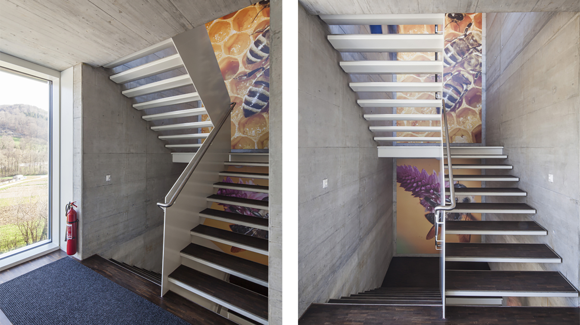 • Das Treppenhaus, sowie die geschlossenen Eckbereiche des Gebäudes übernehmen die Aussteifung. Die Geschossdecken aus Beton sind mit Heizrohren bestückt. Damit die Wärme aus den beheizten Geschossdecken in den Raum gelangt, wurden grosse Teile der Betondecken sichtbar gelassen.